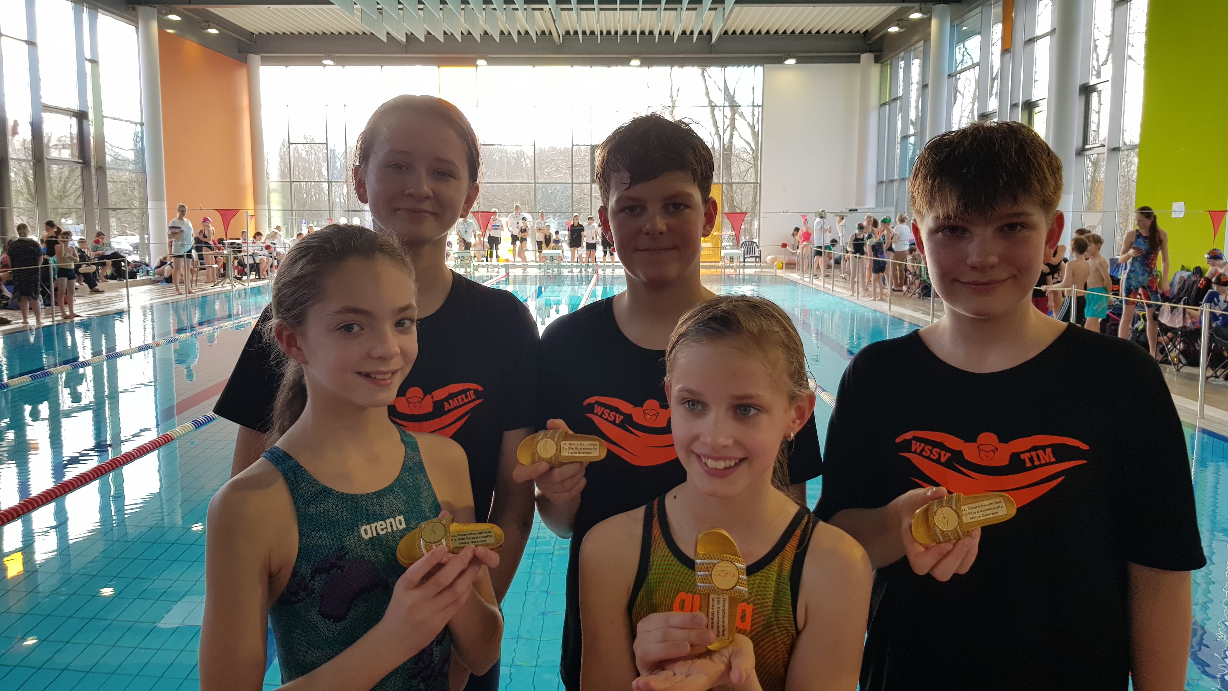 Insgesamt sechs Bezirksjahrgangstitel konnte sich das junge WSSV-Team erkämpfen, gleich drei davon gingen auf das Konto von Emma Elisabeth Woogk (Jahrgang 2015). Sie holte Gold über alle drei Bruststrecken, gewann Silber über die 100 Meter Schmetterling und sammelte dabei viele neue persönliche Rekorde. Lena Berlinska (2014) war in Brust ebenfalls nicht zu schlagen und holte über alle drei Distanzen Gold, wie auch Woogk schlug sie dabei unter den Qualifikationszeiten für die anstehenden Landesmeisterschaften in Hannover an. Lukas Angermeyer (2010), der erst ein Jahr zuvor sein Debut auf Bezirksebene feierte, schwamm gleich viermal unter die Top Drei seines Jahrgangs, sowohl über alle drei Schmetterlingsstrecken als auch über die 200 Meter Lagen gewann er Silber. Dabei schlug er nicht nur bei nahezu jedem Start in neuem persönlichen Rekord an, sondern qualifizierte sich zudem mit einer herausragenden Zeit über 50 Schmetterling erstmals für die im Mai anstehenden Norddeutschen Meisterschaften. Auch Janne Thomßen (2009) schwamm aufs Treppchen, sie holte über die drei Bruststrecken zwei Medaillen in Silber und eine in Bronze, zudem verpasste sie die Medaillenränge mit einem vierten Platz über die 200 Rücken nur knapp. Ähnlich erging es Lina Tönnies (2012), die den dritten Platz zunächst mehrfach um Bruchteile einer Sekunde verpasste, sich schließlich aber über die 200 Meter Schmetterling durchsetzen konnte und dabei in neuer Bestzeit Silber gewann.