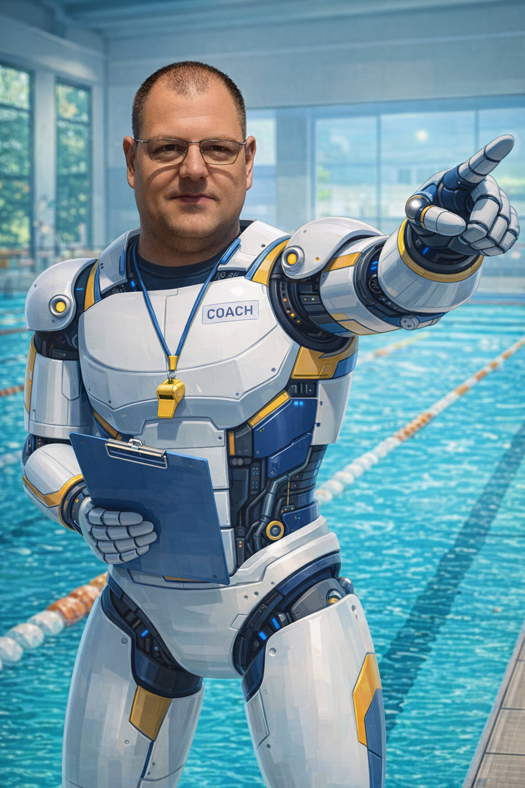 Die bei der Abteilungsversammlung am 24.02.2026 (siehe dort) kontrovers diskutierte Maßnahme zum Thema "erfolgreiche Trainerarbeit" sieht vor, nach und nach alle bisherigen Übungsleitenden durch multifunktionelle, roboterähnliche Trainingsmaschinen auszutauschen. Diese verfügen prinzipiell über dieselben Fähigkeiten wie ihre menschlichen Pendants (insbesondere mit Seh-, Hör- und Sprechfunktion sowie Schwimm- und Rettfähigkeit), sind allerdings bedeutend leistungsfähiger, ausdauernder und - langfristig betrachtet - erheblich preisgünstiger. (Foto: TErsaB-Modell "Trammi", KI-generiert mit freundlicher Genehmigung seines "Paten").