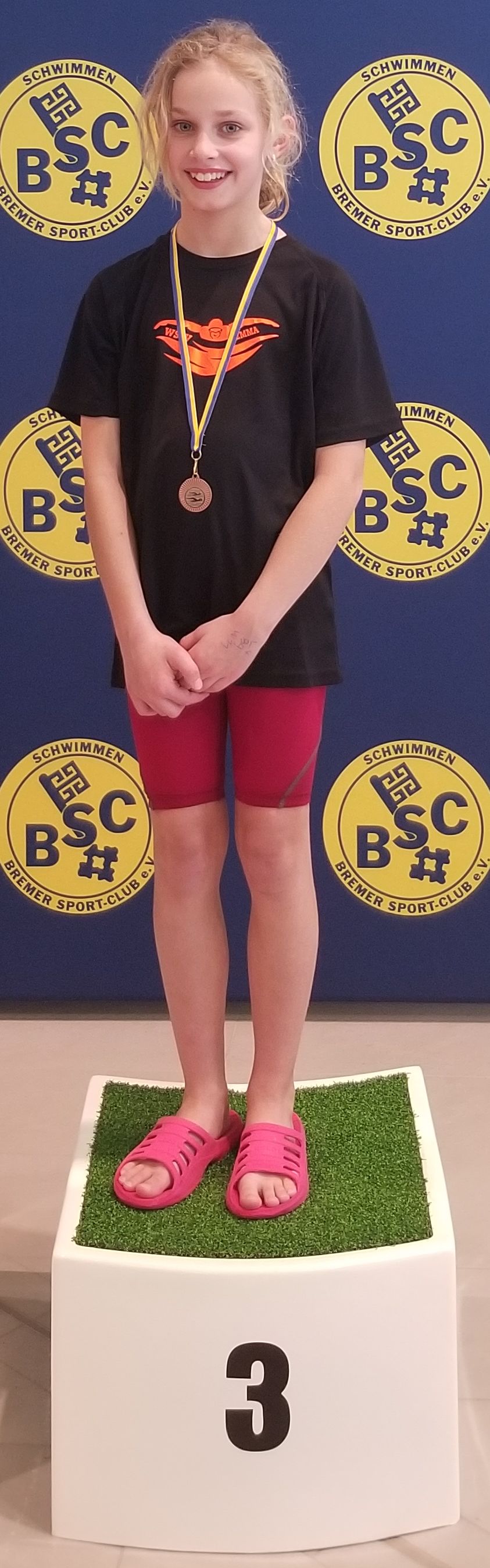 Am erfolgreichsten war dabei wieder einmal Emma Elisabeth Woogk (Jahrgang 2015), die am Tag zuvor bereits in Bremen an den Start ging und nun bei jedem ihrer vier Starts mit deutlichem Abstand zu Platz zwei Gold holte. Auch Svea Fischer (2016) konnte sich mit jedem Sprung vom Startblock auf dem Treppchen platzieren, dabei je zweimal auf dem ersten und zweiten Platz. Bei seinem zweiten Wettkampf überhaupt gelang Fabian Hoffmann (2016) Ähnliches, er sammelte einen ersten und zwei zweite Plätze, lediglich über die 50 Meter Rücken schrammte er mit einem vierten Platz knapp am Treppchen vorbei. Ebenfalls drei Mal unter die drei Schnellsten ihres Jahrgangs schwamm Elisa Konrad (2016), die sich so einen kompletten Medaillensatz sicherte. Malia Lippert (2015) zeigte ihre Stärke auf den Rückenstrecken und konnte sowohl über die 100- als auch über die 50 Meter-Strecke Silber holen. Mila Engel (2013) tat es ihr über die Freistilstrecken nahezu gleich und sammelte dort je einen zweiten und dritten Platz. Ihr Bruder Bennet Engel (2016), der mit seinem Start über 100 Meter Freistil zum ersten Mal über eine Strecke dieser Länge an den Start ging, erschwamm sich dabei Platz drei, nachdem er bereits Bronze über die 50 Meter Brust geholt hatte. Je einmal auf dem Bronzerang landeten Alena Niehuß (2013) und Tanja Amelsberg (1974) über die 100 Meter Brust.