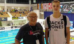 WSSV-Schwimmer David Beser (Foto, mit Schwimmtrainer Siegmund Sladkowski) startete bei den Deutschen Jugendmeisterschaften in Berlin über 50 m Brust, 100 m Brust und 200 m Brust, betreut wurde er dabei von seinem WSSV-Schwimmtrainer Siegmund Sladkowski. Schwimmer aus über 200 Vereinen gingen in 14 Wettkampfabschnitten in den 5 Tagen auf den 50-m-Bahnen des Europa-Sportbades an den Start und sorgten für eine tolle Atmosphäre. "Es ist schon sehr beeindruckend, was für Leistungssprünge einige Schwimmer hier in den Wettkämpfen machen. Für David hätte ich mir etwas mehr gewünscht, weil er gut trainiert hat. Aber dass die "Trauben hier höher hängen", war mir natürlich auch klar! Unterm Strich ist eine Teilnahme an den Deutschen Meisterschaften für unsere Schwimmer aus der Region Wilhelmshaven etwas ganz, ganz Besonderes", so Trainer Sladkowski. Über die 50 m Brust gelang David eine neue persönliche Bestzeit von 0:32,53, womit er einen guten 19. Platz unter 34 Startern belegte. Über 100 m Brust belegte er Platz 23 in einer Zeit von 1:12,84 und über 200 m Brust schwamm er 2:39,30, was den 15. Platz ergab.